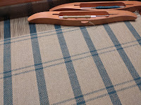 Den lysegrønne hør er arvegods, som har levet en lidt tilbagetrukket tilværelse bagest i skabet; den er tynd - ca. 30/1 - så jeg har ladet 2 tråde følges ad i søl. En tilsvarende flaskegrøn hør holdt med selskab på hylden med tynde hørgarner, så den fik lov at lave striber, og en flaskegrøn hør 30/2 dannede kant med et par tråde i hver side.
